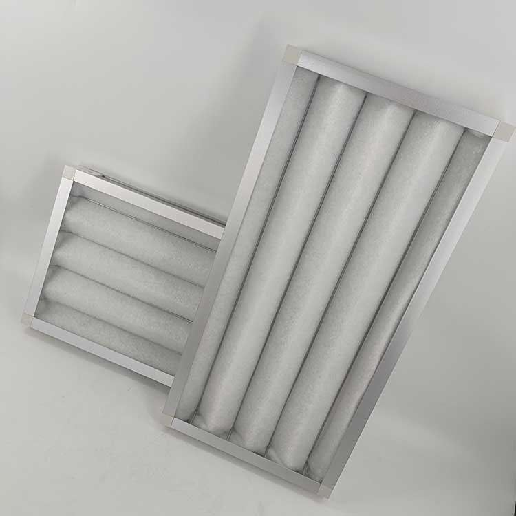板框空氣過濾器在填充濾材前,先將一層鍍鋅鐵網(或不銹鋼網)貼合在濾材的出風面上,待填入濾材后,再蓋上一層鍍鋅鐵網(或不銹鋼網),這兩層鐵網不但能保護濾材不被吹破,亦能防止濾材因風壓力而造成變形,故能確保所有濾材表面皆能被充分利用。